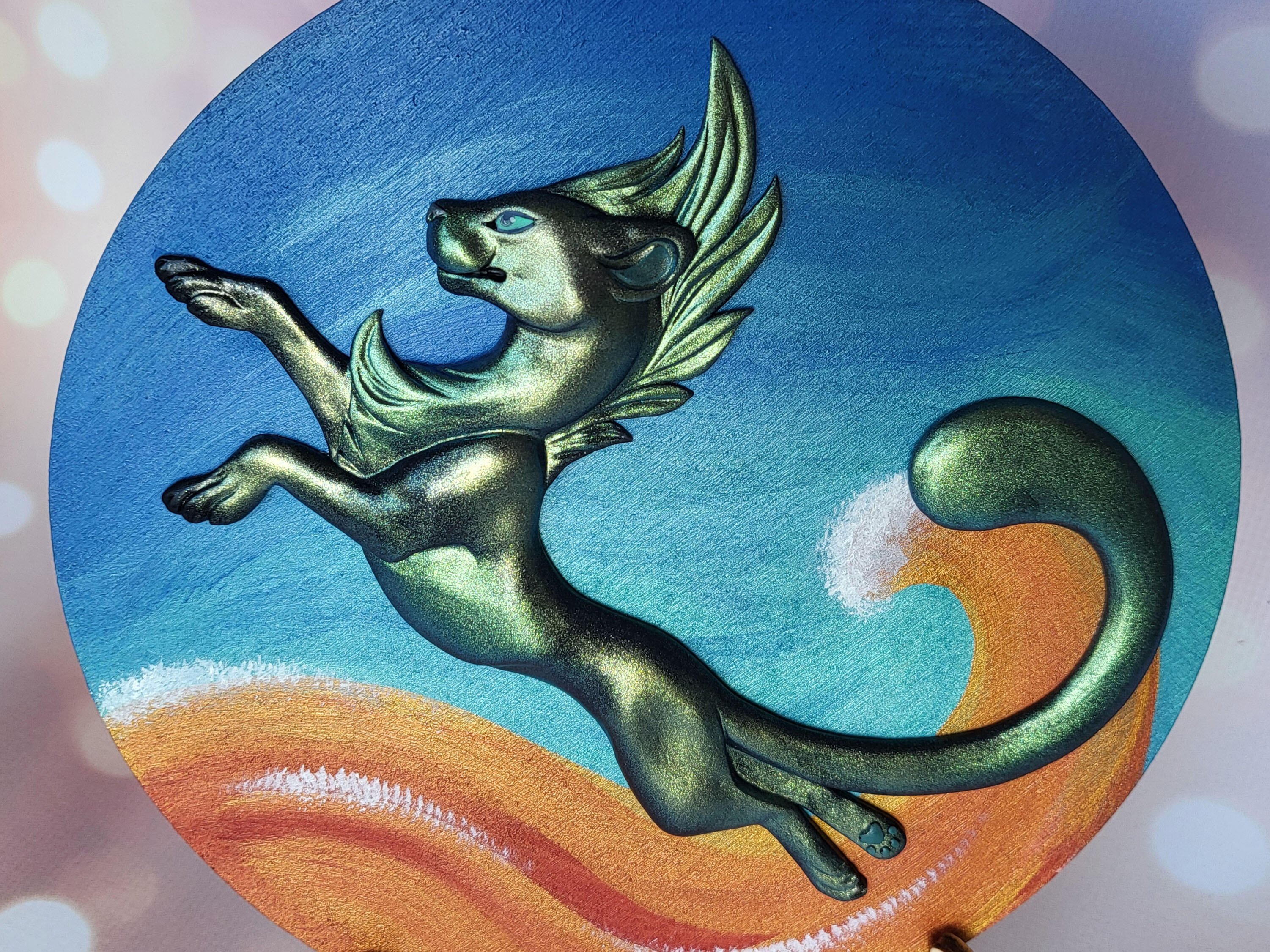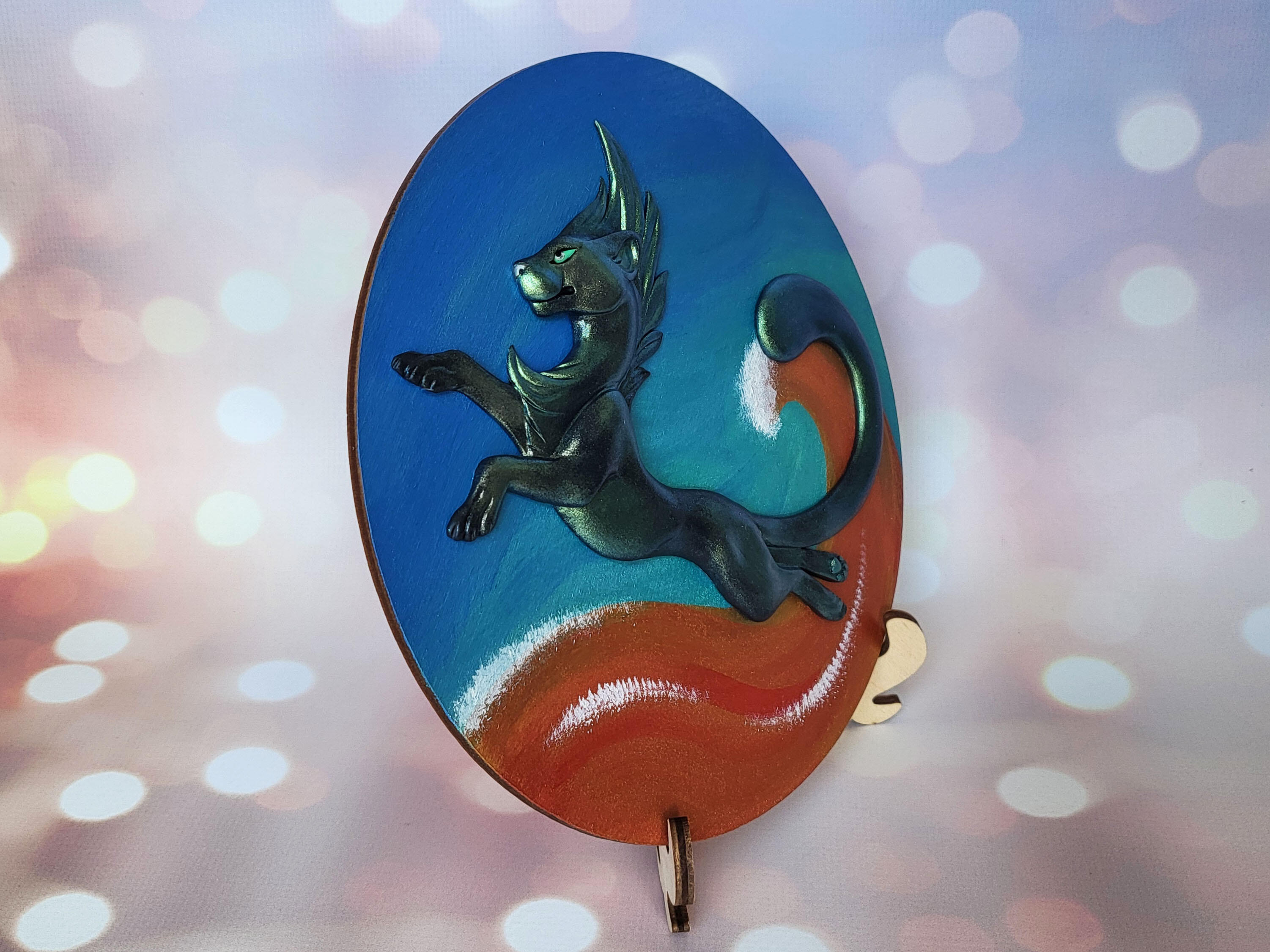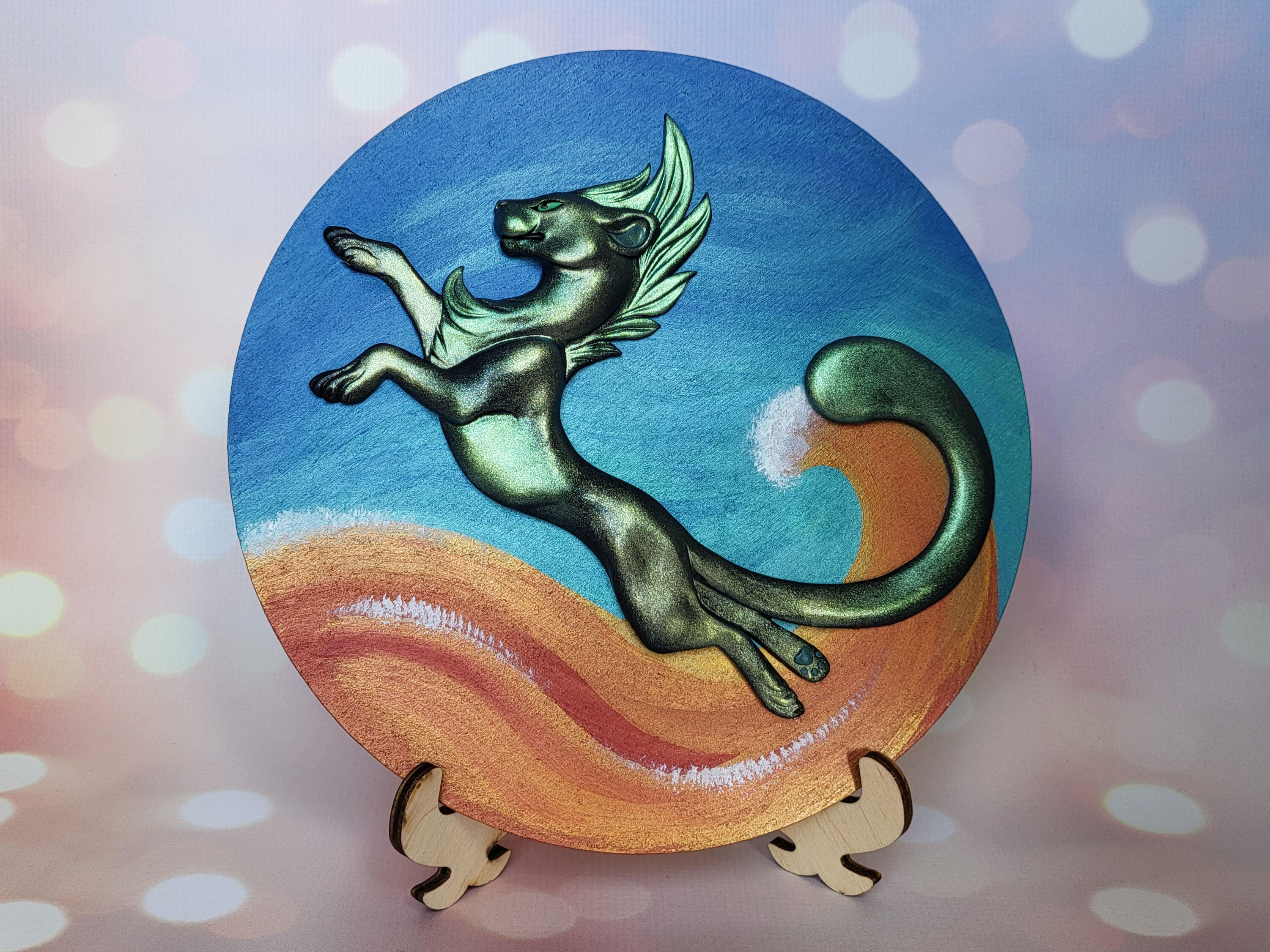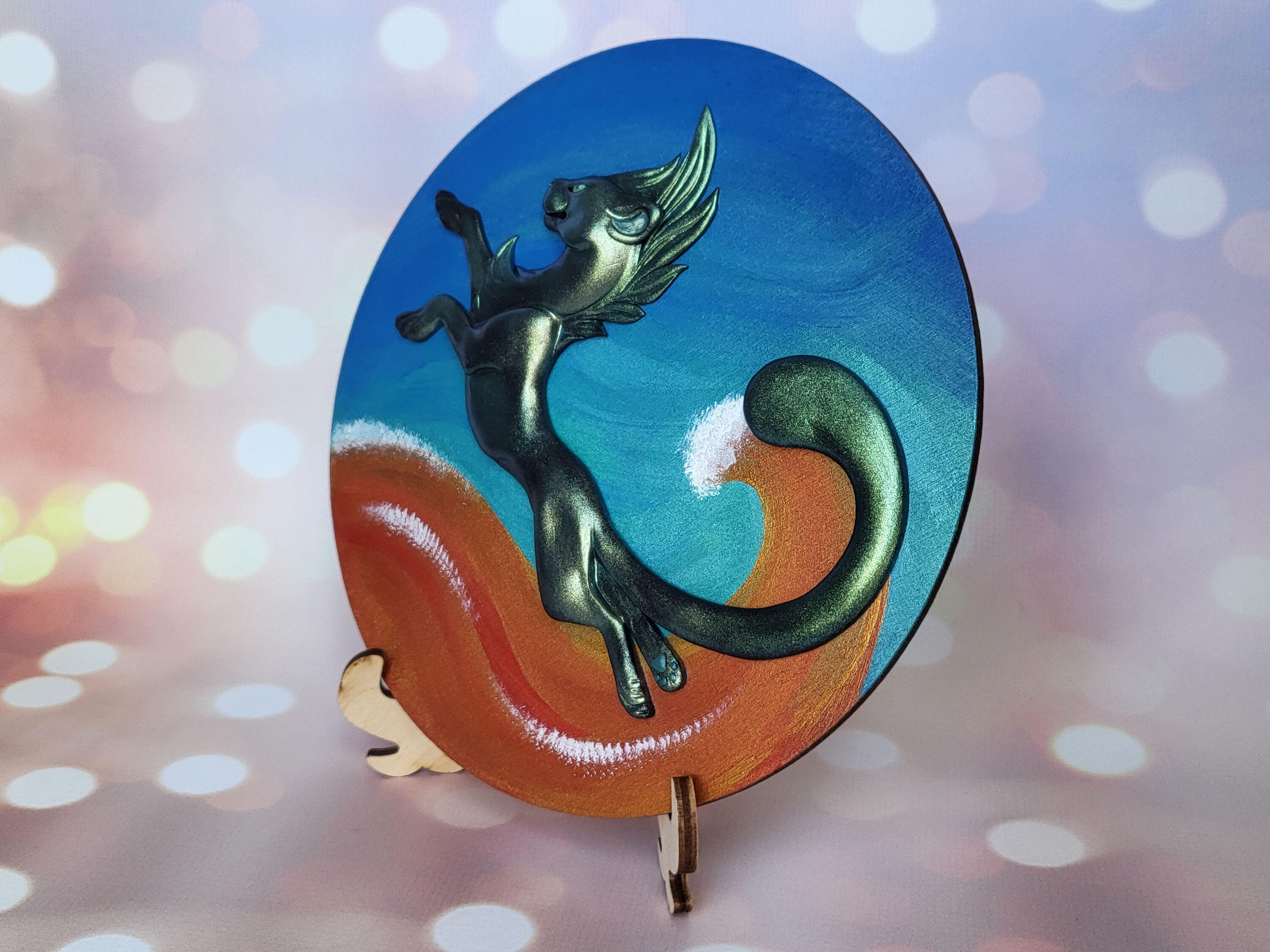 A graceful bas-relief of a jumping feline, created to bring an inspiration and an atmosphere into your space. The wooden base is hand-painted with acrylics, while the jumping figure is hand-sculpted and cast by me. Each piece from The Jumping Cats series is one of a kind, carrying its own meaning and story. At the moment, two pieces are available: one jumping against a rising sun, and one jumping against a wave.The artwork comes with its own wooden stand. Dimensions: 17 × 17 cm (6.7 × 6.7 inches).Price per piece: 35 USD + shipping (15 USD or free shipping if shipped with another item).