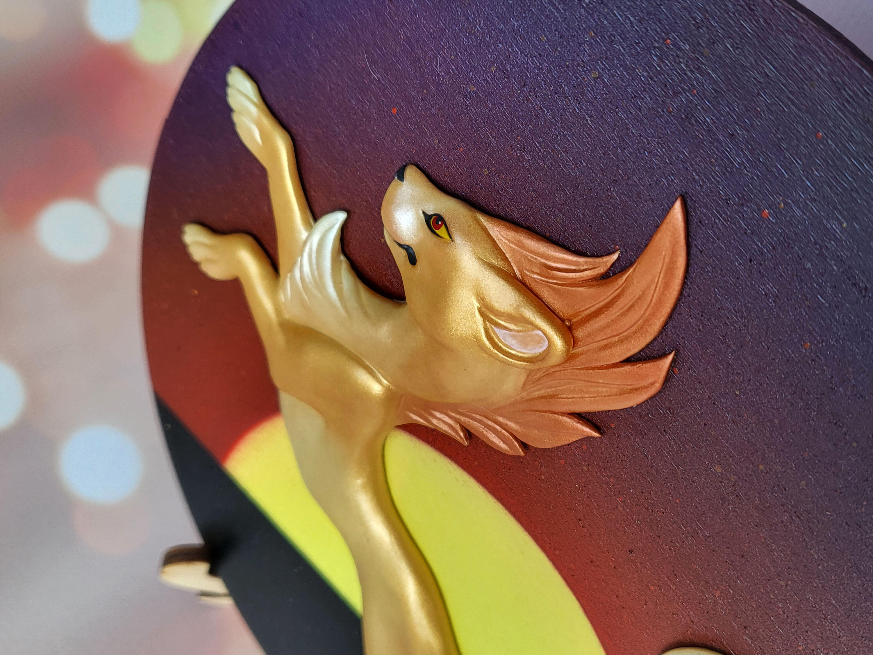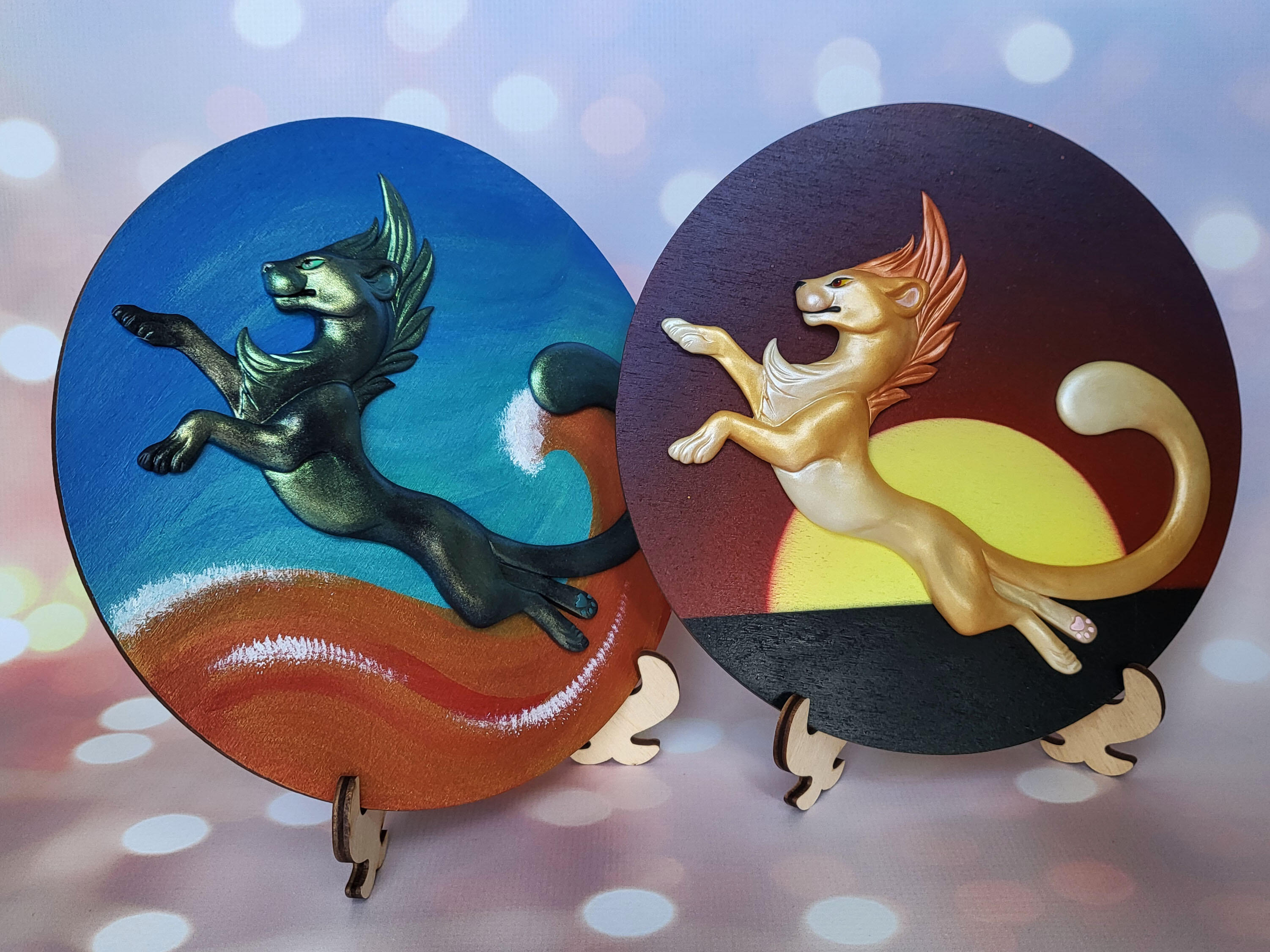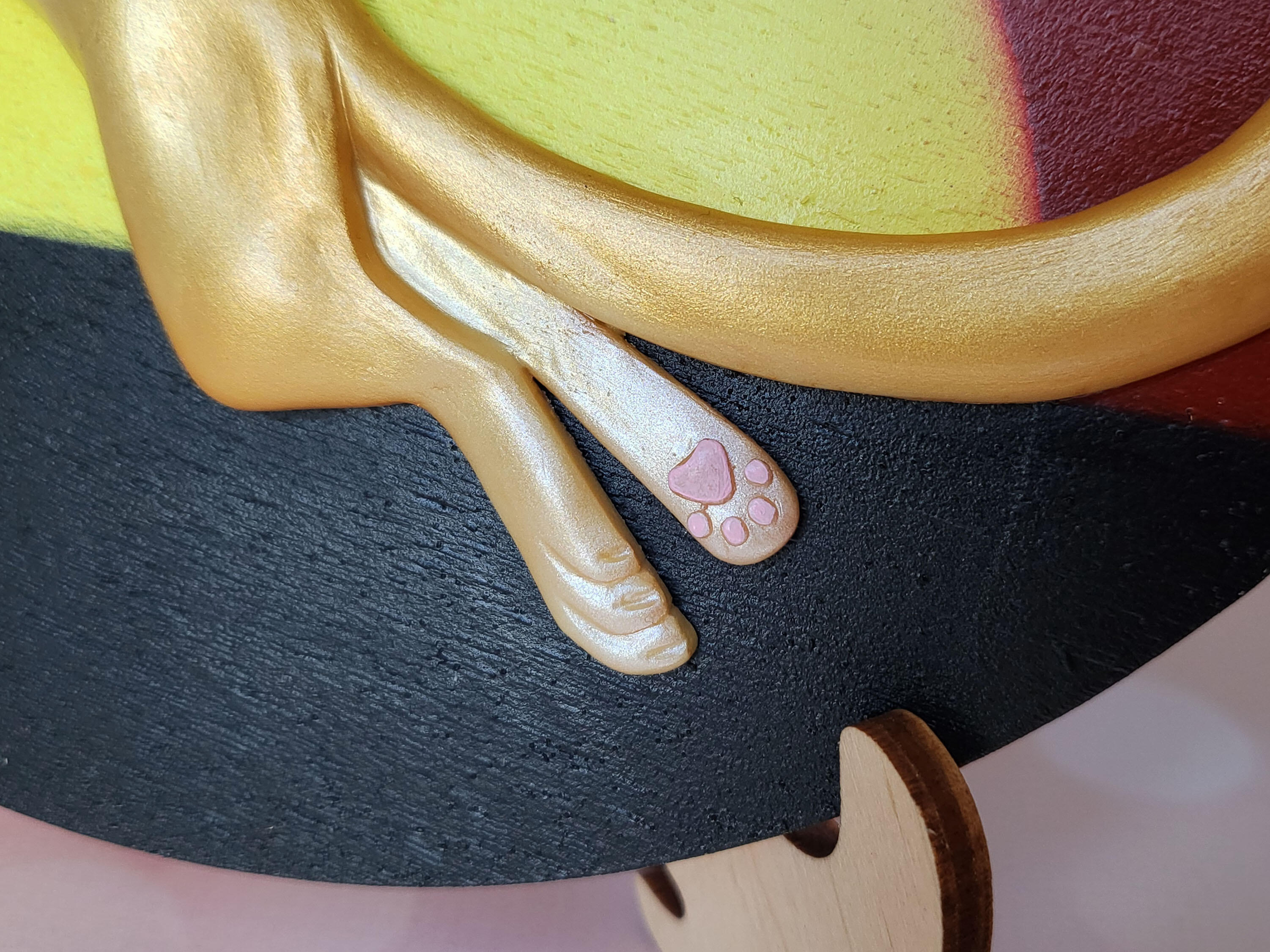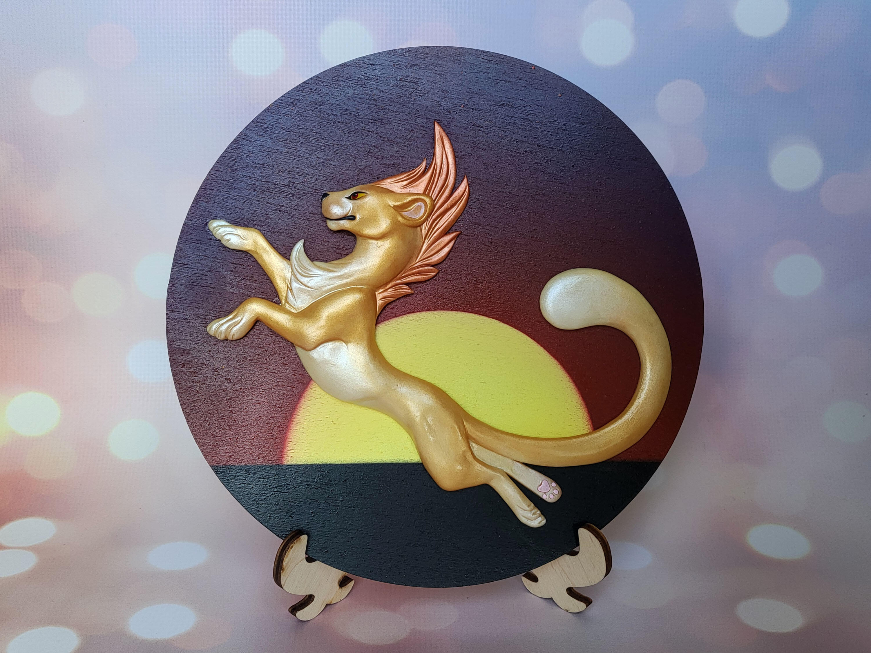 A graceful bas-relief of a jumping feline, created to bring an inspiration and an atmosphere into your space. The wooden base is hand-painted with acrylics, while the jumping figure is hand-sculpted and cast by me. Each piece from The Jumping Cats series is one of a kind, carrying its own meaning and story. At the moment, two pieces are available: one jumping against a rising sun, and one jumping against a wave.The artwork comes with its own wooden stand. Dimensions: 17 × 17 cm (6.7 × 6.7 inches).Price per piece: 35 USD + shipping (15 USD or free shipping if shipped with another item).