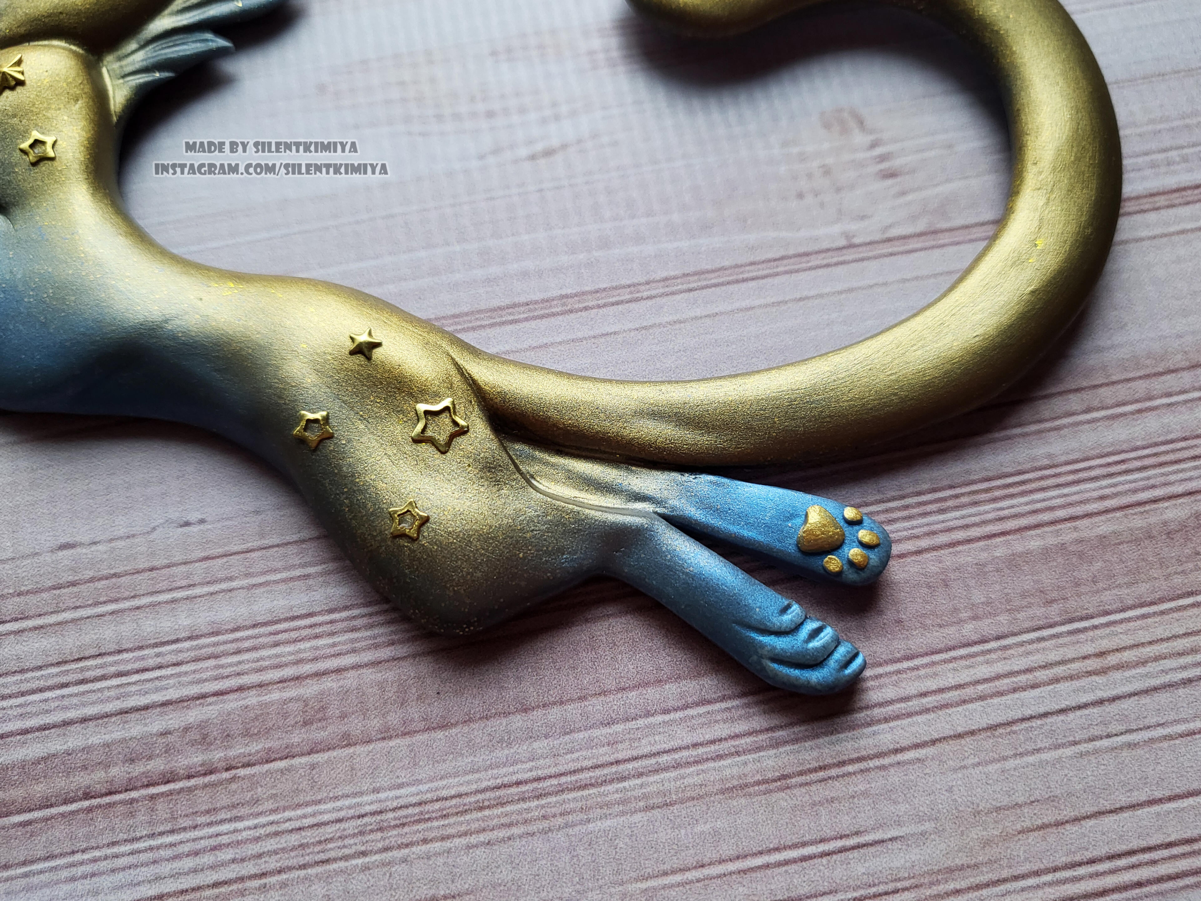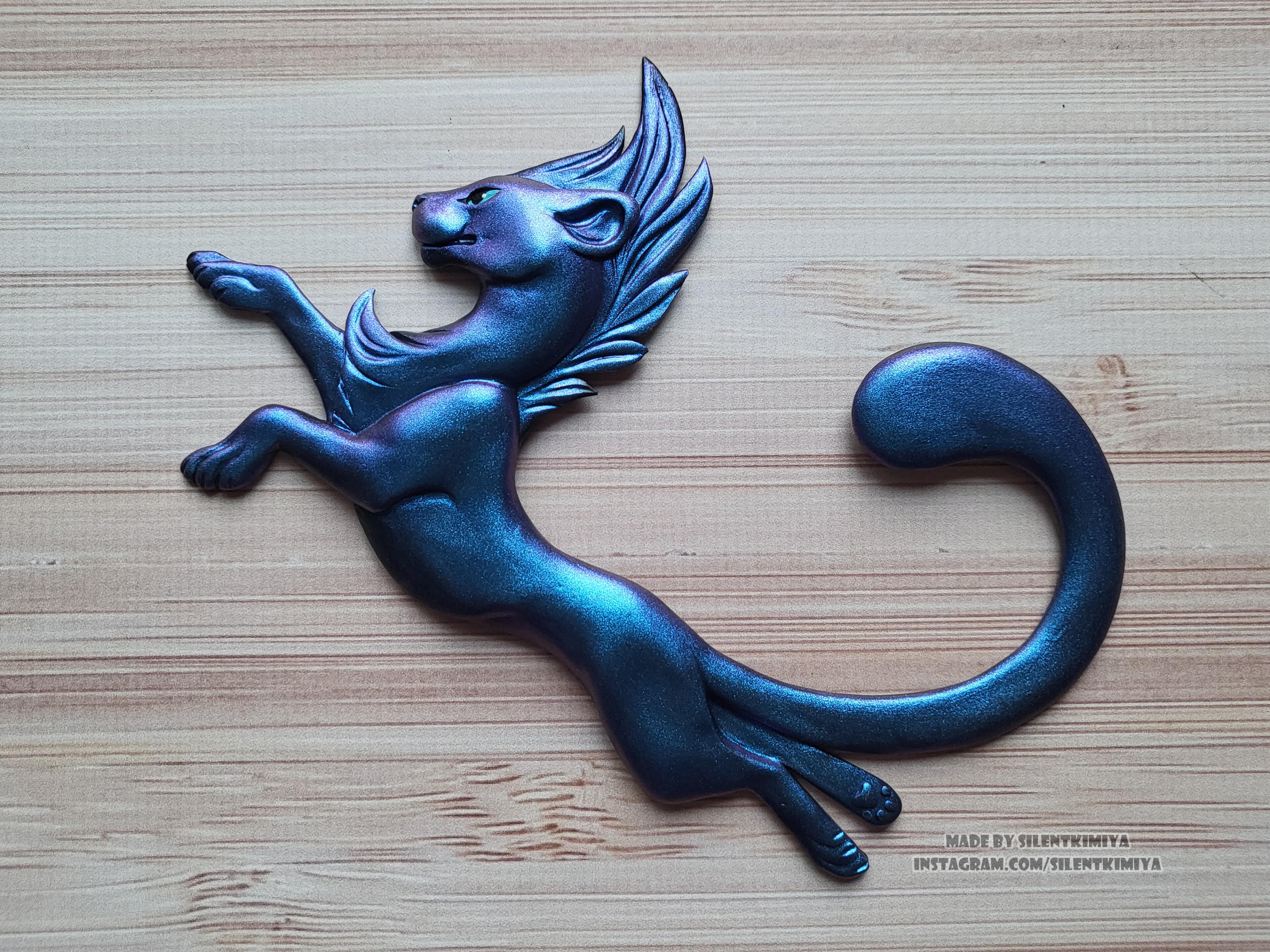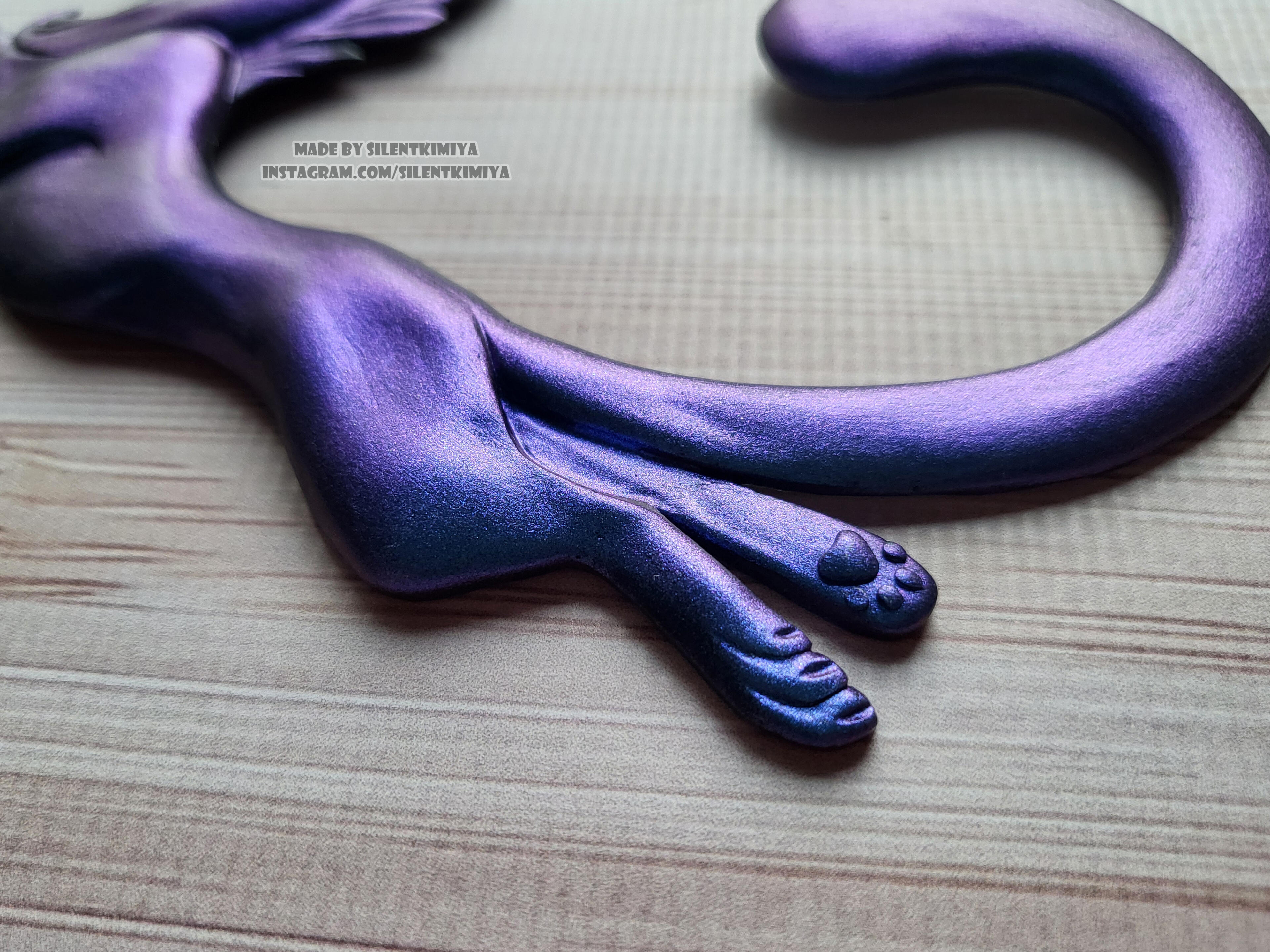 Blue or violet? It all depends on how this cat chooses to reveal itself to you. Cat's chameleon-like coat allows it to transform the appearance - everything depends on the angle from which you look at it.A polyurethane cast made from my original master model, hand-painted with acrylics and finished with a protective matte varnish. Handmade, one of a kind.Dimensions: 15 cm = 5.9 inches long.
